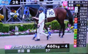 元出資馬パルメの仔、ノーブルスナイパーが、今日の中山2R(3歳未勝利・ダ1800m)に出走しました🐎